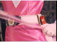 Close-up of Pink's holster as she unfurls pink ribbon from beside it. |