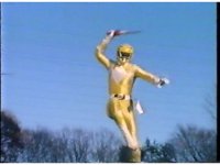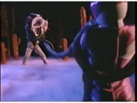 Zoom out from helmet, as Blue Ranger holds both ends of Power Lance in the air, then throws them upward. |