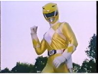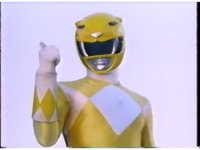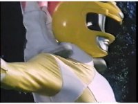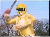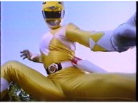 Directly upward close angle on Yellow Ranger looming over camera, spreading arms, then crouching above the lens in a pose. |