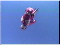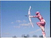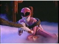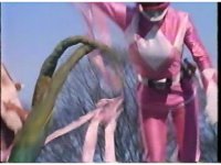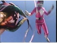 Upward angle of Pink Ranger getting thrown through the air past Bloom of Doom thanks to his ribbon yanking. |