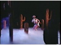 Facing the Earth cut-out, Lord Zedd spreads his arms out, then turns around, slowly steps down the balcony stairs, raises his arms again, and steps toward Goldar on our left. |