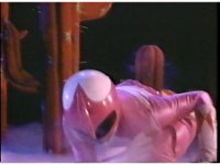 Pan up from his feet as Bloom of Doom shakes off the broken ribbon binds, free and unharmed. |