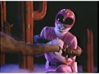 Close on Yellow, shifting arms about while watching helplessly as her teammates suffer. Pan left to Pink, who points at and nod-talks to the monster, before reaching for holster. |