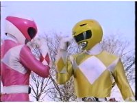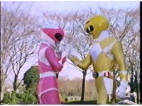 Zoom out as Pink lands, Yellow rushes to her side to exchange a comment, and the other four Rangers finally regroup with them. |