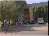 Exterior of the Youth Center, two females walk together to door, as skateboarder passes across parking lot, and football-bouncing guy exits. |