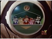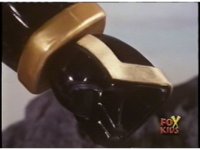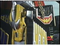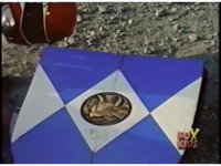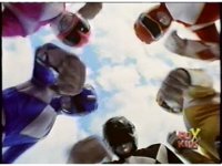 Freeze frame on green chest gem, as the five Power Rangers in the Megazord cockpit superimposes within, as they each cross their arms in front of their chests, then switch to folding forearms, then grabbing controls. A bright flash erupts to conclude it, engulfing the screen. |