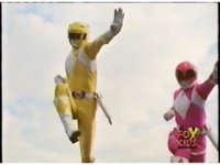 Close on Yellow Ranger, punches left hand forth, right hand down, left hand down with right arm up behind her in a pose. Then quickly punches with right hand downward, before thrusting left hand outward, right arm curled behind. |