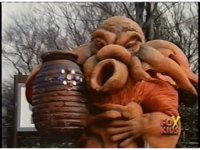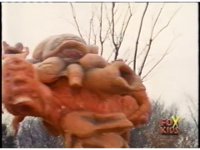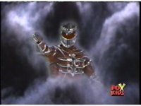 Standing on balcony, with Goldar cheering him on, Lord Zedd switches staff to right hand, looks at left, creates a growth grenade, then pitches it over the railing, causing flashing of light. |