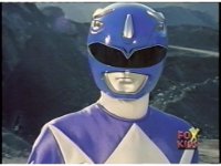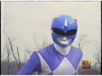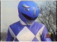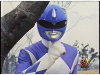 Close on Blue Ranger, crossing arms in front of face before posing down in a crouch, then another to our left. |