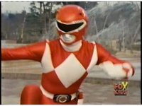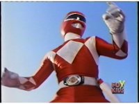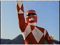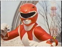 Close on Red Ranger, posing with arms up, crossing to a pose to our left, then a final one to our right. |