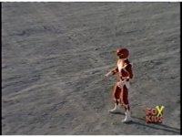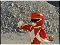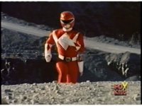 Red Ranger sprints up over a quarry hill, straight toward us. |