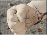 Close-up of Thunder Megazord's left fist turning palm-down, then pulling away. |