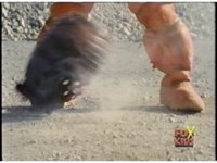 Close on Blue stepping forth, then lowering head and turning head slowly in shame. |