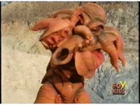 Images of Lord Zedd motioning arms and talking, appearing upon the cave wall. |