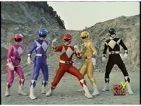 The five Rangers jump back at the sight of the giant menace, then all turn to our upper right, raise arms and make summoning gestures. |