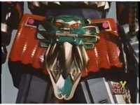 Close on Red Dragon's head as the helmet locks down over it. Pan down to green gem on chest plate. |