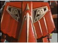 In front of blaze and amid electricity, Red Dragon's new head floats into slot on body, connecting in a flash. As the flash fades, gone is the burning backdrop, as Red Dragon's new humanoid form spins to life beneath a blue sky, amid continued crackling of electricity. |
