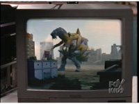 Brief shot of Thunder Megazord being bombarded by sparks and smoke in the city. |