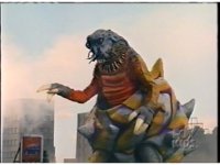 Closer on the bubbling waters, as the head of the Dragonzord rises from beneath the waves. |