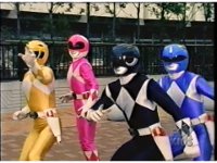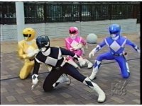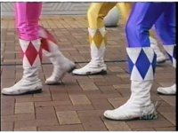 Close on the boots of Pink, Yellow, and Blue Rangers as they come together and jump up. |
