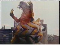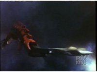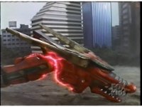 Pan right along the body of downed Red Dragon Thunderzord in Warrior Mode, red electricity crackling along it, stopping at its head. In a sudden glow of reddish yellow, Warrior Mode reverts to regular Dragon, lying on the ground for a moment before its eyes light up and it lifts off. |