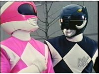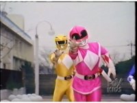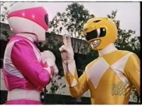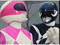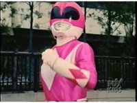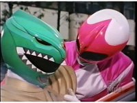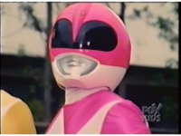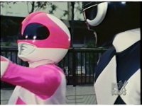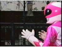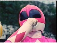 Close on Pink Ranger, raising both arms at sides then crossing at the wrist in front of chest, bending down and throwing arms back like wings before standing back up and crossing arms as she holds right arm up and back while left hand is held poised near waist. |