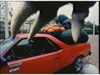 The monster's giant hand reaches down and scoops up the crate of various melons from the back of an ugly car. |