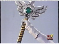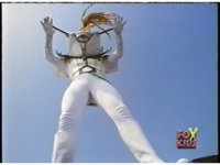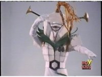 Standing on balcony, with Goldar cheering him on, Lord Zedd switches staff to right hand, looks at left, creates a growth grenade, then pitches it over the railing, causing flashing of light. |