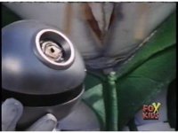 Alpha ceases touching buttons, looks up at Zordon's tube, fretting hands, arms raised and bent at elbows. After a moment, he turns around and shot pushes out as he walks away from the console, arms still up and elbows bent, as he steps down and hurries up the path to the Viewing Globe. |