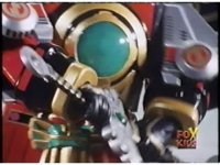 Freeze frame on green chest gem, as the five Power Rangers in the Megazord cockpit superimposes within, as they reach out and up with their right hands, then gesture them around into fists, before grabbing controls. A bright flash erupts to conclude it, engulfing the screen. |
