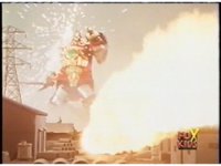 Close on Thunder Megazord as it's thrown about by spark burstings. |