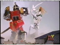 Close on Thunder Megazord turning to its right and around until its back is to us, while motioning Saber widely. |