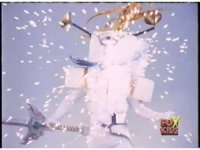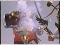 As Thunder Megazord turns to face us and holding saber down and outward, Trumpet Top falls to his knees behind it, then collapses and explodes into a bright, spark-filled explosion and smoke eruption, which finally prompts the Megazord to prepare to resheathe saber. |