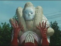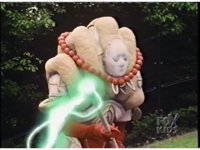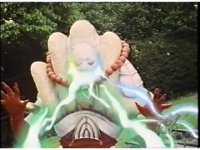 Standing on balcony, with Goldar cheering him on, Lord Zedd switches staff to right hand, looks at left, creates a growth grenade, then pitches it over the railing, causing flashing of light. |