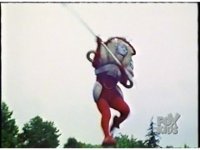 Close on Nimrod, gripping mouth with both hands then spreading them out, unleashing multicolored energy from her mouth. |