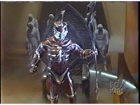 Lord Zedd stands at throne, turning from our left to our right as shot zooms in, and he emits his red ray vision. |