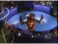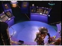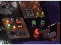 Close-up of console full of multicolored lighted buttons, as Alpha presses the left, large, red, jolly, candylike one. |