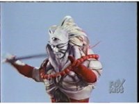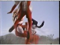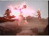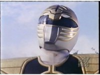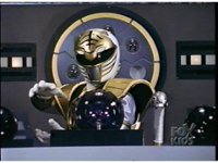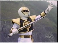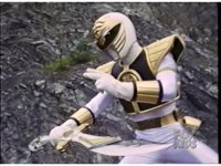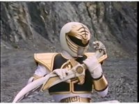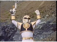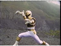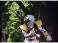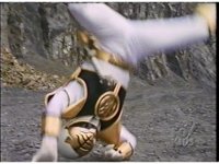 White Ranger flips over and rolls onto his back, legs in the air for a moment, then finally sitting up, dazed. |