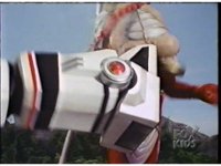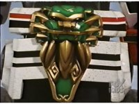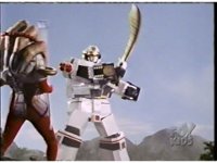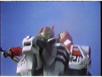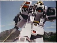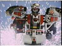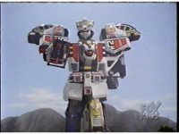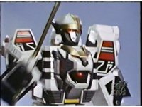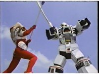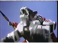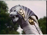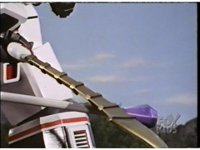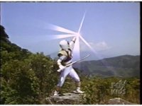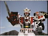 White lands atop White Tigerzord's head, turns to us, punches forth, then turns saber upside down, holding Saba up, head up. |
