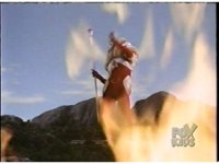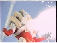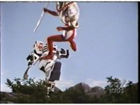 Upward shot of White Tigerzord leaping right over the camera with RDTZWM atop it and staff held forth. |