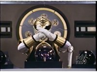 In White Tigerzord's cockpit, zoom out as White enters, faces us, holds Saba horizontally, then again with blade readied, before beginning to insert him into console. |