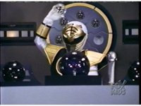 In Tigerzord cockpit, White Ranger spreads arms fiercely, then zoom in sharply as he punches left fist forth. |