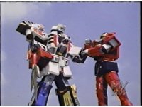 As Firebird soars toward our slight left, MegaTigerzord fires a beam of red energy from its Tiger head chestmouth at it, charging the flying Thunderzord with flaming power. |
