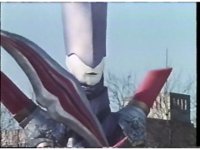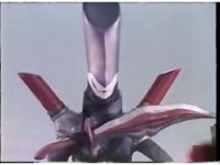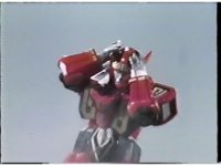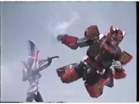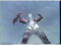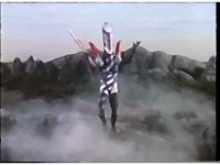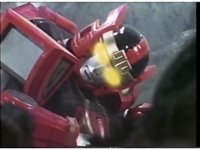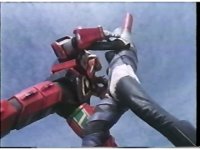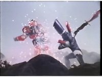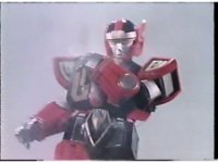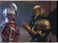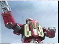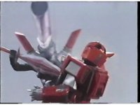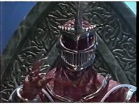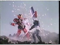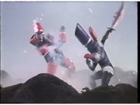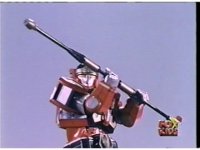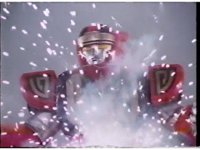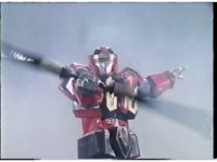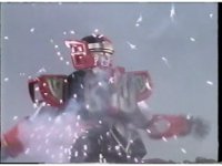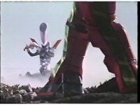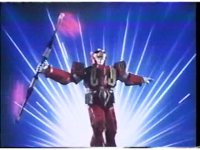 Looking straight upward and staggering back, Red Ranger whips Power Sword around to his left hand, raises his right hand, summons, then lowers fist while nodding. |