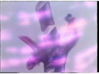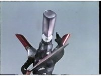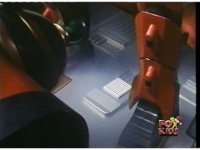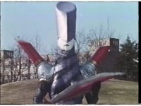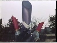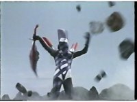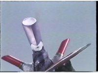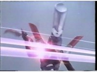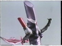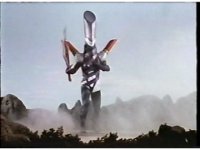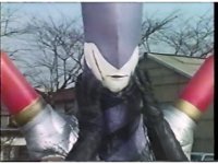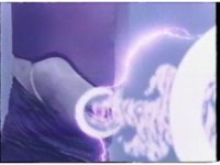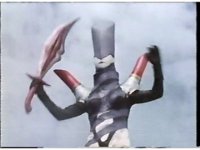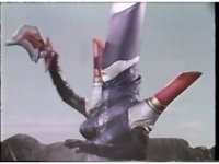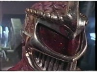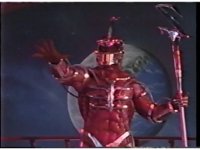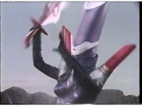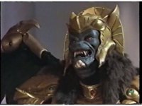 Standing on balcony, with Goldar cheering him on, Lord Zedd switches staff to right hand, looks at left, creates a growth grenade, then pitches it over the railing, causing flashing of light. |