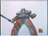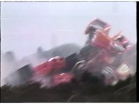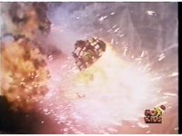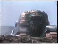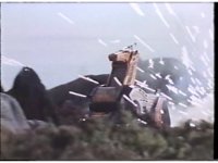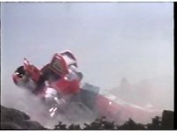 Pan left as Griffin Thunderzord glides stiffly across terrain, sparks and dirt-bursts erupting around it. |