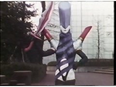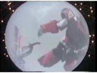 Upward side angle as RDTZWM & Lipsyncher grab each other in a close shoulder lock, until the Zord breaks out of it. |