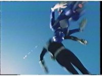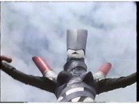 Close on Blue Ranger, crossing arms in front of face before posing down in a crouch, then another to our left. |