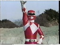 Close on Red Ranger, posing with arms up, crossing to a pose to our left, then a final one to our right. |