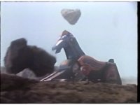 Side angle on Unicorn Thunderzord gliding to our left, raising and lowering head, lifting loose boulders up all around it. |